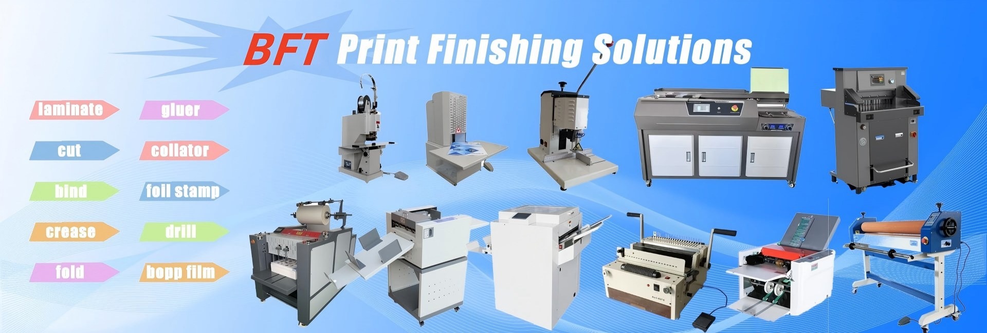 Productos principales:Máquina laminadora, punzonadora, máquina plegadora, máquina cortadora, máquina encuadernadora